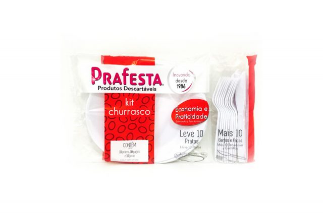 Kit Prato Churrasco. Contém 10 pratos, 10 garfos e 10 facas.